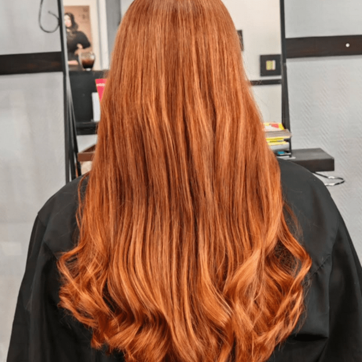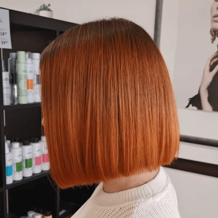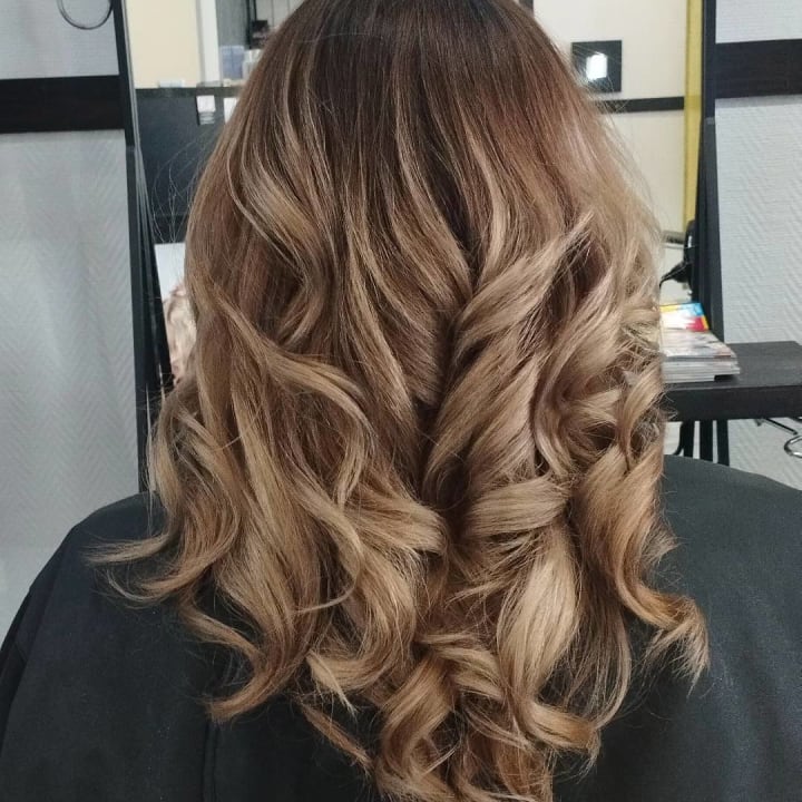 Monivärivärjäys, hiukset lapaluiden alapuolella.